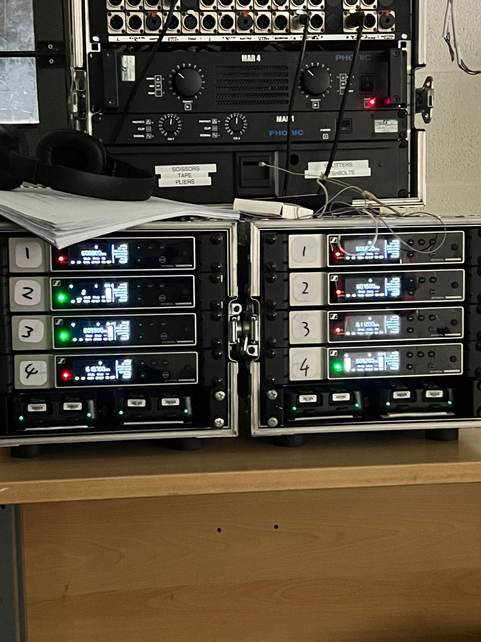 Sound: 8x Sennheiser EW-D EM Recievers with 8x EW-D SK Bodypack Transmitters with 8x beige headsets fed into the Yamaha MX12/8 Mixer for mixing which was then played through 2x 500w 15" Speakers.